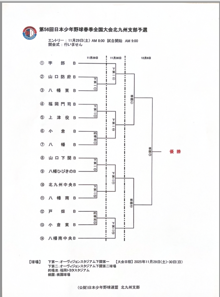 11/29・30・12/6〔八幡南B〕〔八幡南中央B〕第56回日本少年野球春季全国大会北九州支部予選 ■大会日程:2025年11月29日(土)・20日(日)・12月6日(土) ■主管:日本少年野球連盟北九州支部 第56回日本少年野球春季全国大会北九州支部予選 By webmaster | 2025/11/29 | 2025公式戦履歴 | ← 11/24〔八幡南B〕練習試合 福岡志免ボーイズ 11/29〔八幡南B〕第56回日本少年野球春季全国大会北九州支部 1回戦 →