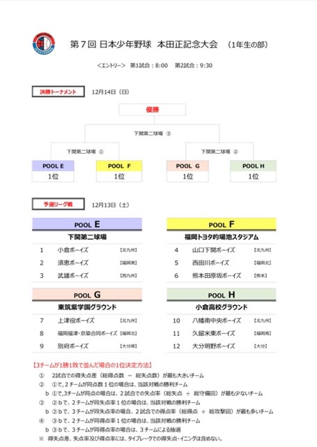 12/13・14〔八幡南中央〕第7回日本少年野球 本田正記念大会(1年生の部) 大会日程:2025年12月13日(土)・14日(日) 【組み合せ表】1年生の部 By webmaster | 2025/12/12 | 2025公式戦履歴 | ← 12/12〔八幡南B〕〔八幡南中央B〕スポーツ報知新聞に記事が掲載されました。 12/13〔八幡南中央B〕第7回日本少年野球本田正記念大会(1年生の部)第一試合目 →