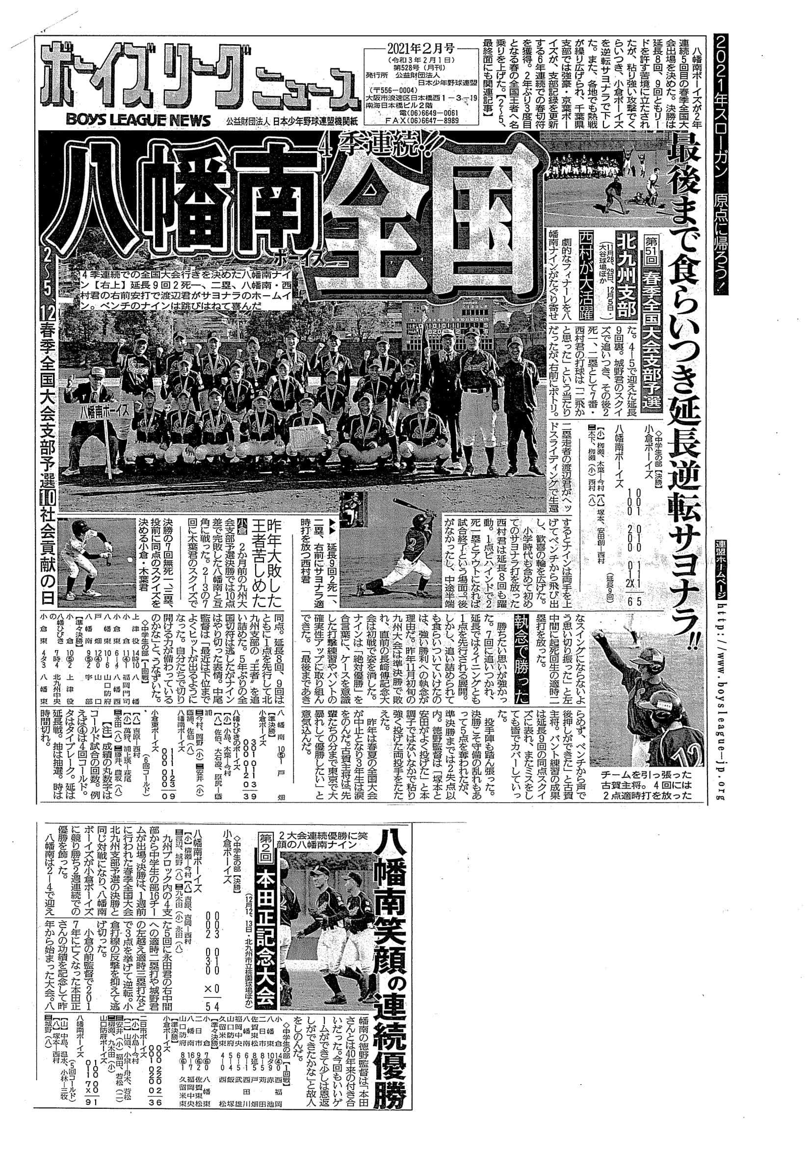 2/11 ボーイズリーグニュースに掲載されました。 2021年2月11日(木) ボーイズリーグニュースに第51回春季全国大会北九州支部予選、第2回本田正記念大会の 記事が掲載されました。 PDFへ By webmaster | 2021/02/11 | インフォメーション | ← 2/11 練習試合 球道ベースボールクラブ 2/14 差し入れを頂きました。 →