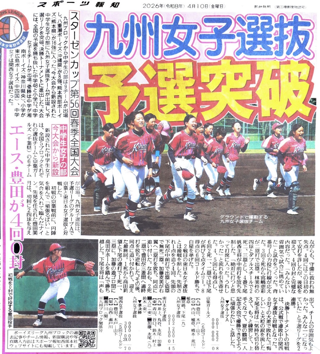 4/11 スポーツ報知新聞に記事が掲載されています!! 2026年4月11日(土) 八幡南中央ボーイズに所属する『宮嶋恵彩』さんが九州女子選抜として第56回春季全国大会に出場しました。その記事がスポーツ報知新聞に掲載されました。 Screenshot By webmaster | 2026/04/11 | インフォメーション | ← 4/11〔八幡南B〕練習試合 鷹羽ボーイズ 4/12〔八幡南B〕練習試合 大分中津ボーイズ →