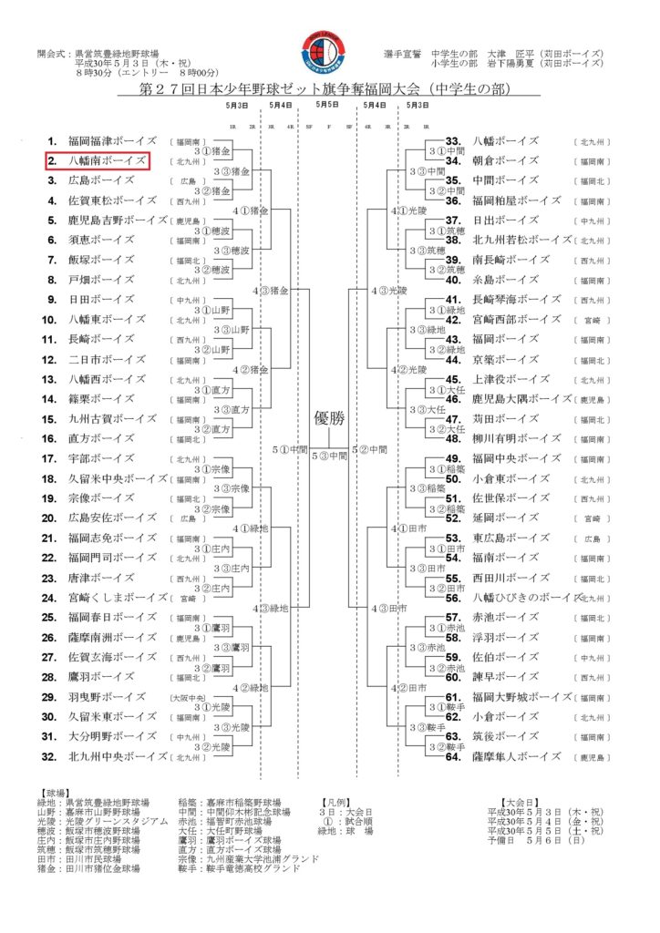 5/3・4・5 第27回日本少年野球ゼット旗争奪福岡大会 ■ 大会日程:2018年5月3日(木・祝)4日(金・祝)・5日(土・祝)予備日:6日(日) ■ エントリー:5月3日(木・祝)8:00 ■ 開会式:5月3日(木・祝)8:30 県営筑豊緑地野球場 ■ 主管:日本少年野球連盟福岡県北支部 ■ 戦 績 1回戦 2回戦 3回戦 4回戦 準決勝 決 勝 表彰式 By admin | 2018/04/29 | 2018公式戦履歴 | ← 4/29 練習試合 福岡粕屋ボーイズ 5/1 ボーイズリーグ ニュースに掲載されました!! →