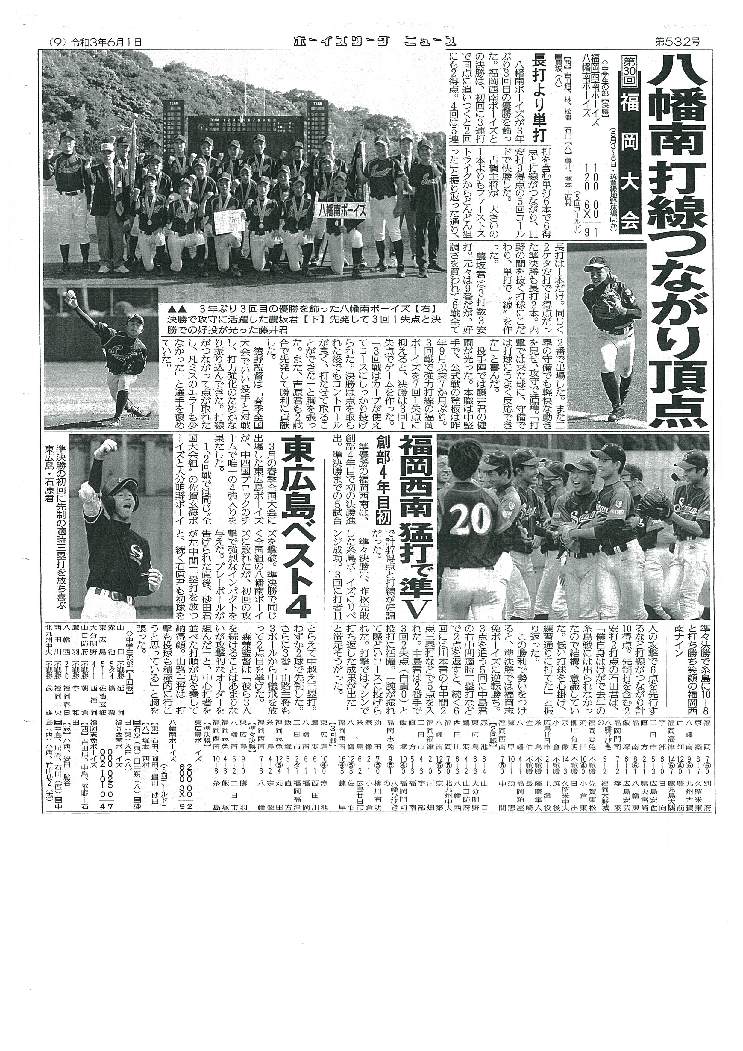 6/12 ボーイズリーグニュースに掲載されました。 2021年6月12日(土) ボーイズリーグニュースに第30回日本少年野球ゼット旗争奪福岡大会の記事が掲載されました。 PDFへ By webmaster | 2021/06/12 | インフォメーション | ← 6/12 練習試合 福南ボーイズ 6/13 練習試合 福岡西南ボーイズ →