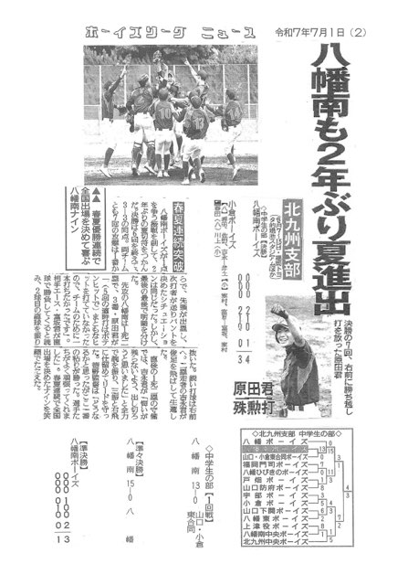 7/1〔八幡南B〕ボーイズリーグニュースに掲載されました! 2025年7月1日(火) 第56回日本少年野球選手権大会北九州支部予選の八幡南ボーイズ優勝の記事が掲載されました。 春夏連続突破しました‼︎ このままの勢いで夏まで突き進みます。 応援よろしくお願いします。 記事のPDFはこちら By webmaster | 2025/07/01 | インフォメーション | ← 7/26・27・8/2 [八幡南中央B] 第19回日本少年野球九州ひぜん信用金庫旗争奪西九州大会 7/5 [八幡南B] 2025年GCUP全日本中学野球選手権大会九州Aパート予選 1回戦 →