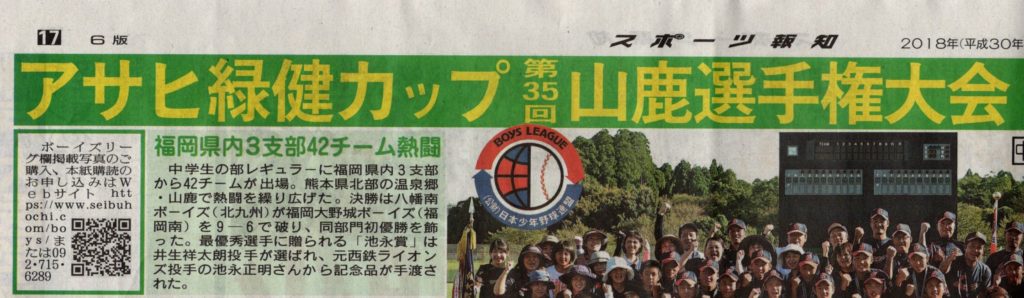 9/6 スポーツ報知新聞に掲載されました! 平成30年9月6日(木)スポーツ報知新聞に八幡南ボーイズ 第35回アサヒ緑健カップ山鹿選手権大会優勝の 記事が掲載されました。 By admin | 2018/09/06 | インフォメーション | ← 9/2 第35回日本少年野球山鹿選手権大会 表彰式 9/17 練習試合 西田川ボーイズ →